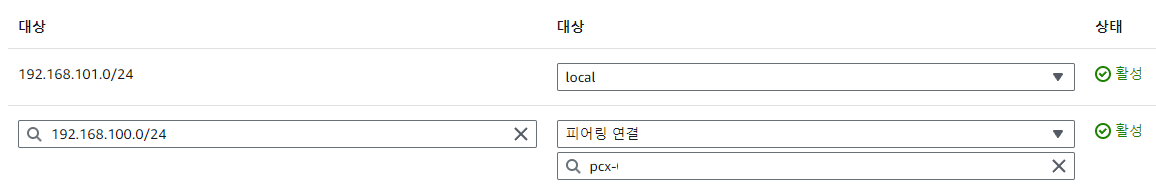 현재 사용중인 로컬 대역은 192.168.101.0/24 이고, 목적지가 192.168.100.0/24 인 패킷은 모두 연결된 피어링으로 보내도록 설정한다. 반대쪽도 동일하게 설정해 주어야 응답이 가능해진다.