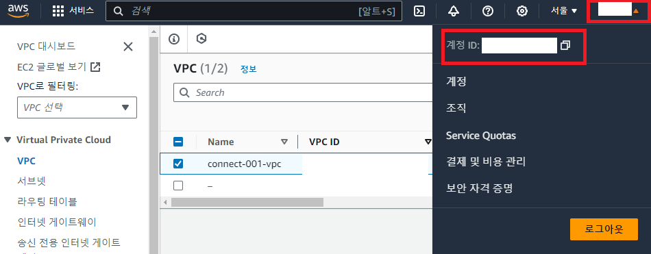 VPC ID는 VPC 메뉴에서, 계정 ID는 AWS 우측 상단의 계정 닉네임을 클릭하면 볼 수 있다.