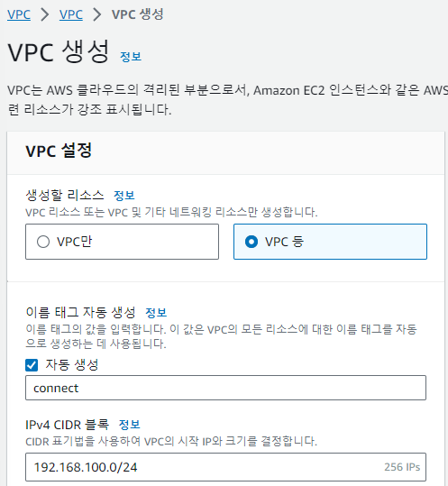 한꺼번에 만드는 것이 편리하므로 "VPC 등" 을 선택하고 VPC 이름과 CIDR를 설정한다.