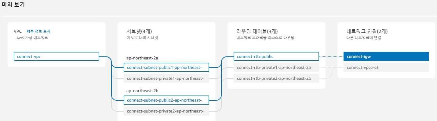 오른쪽 미리보기에 설정한 내용에 따라 VPC 네트워크 현황이 시각적으로 표현되므로 참고하자.